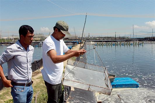 Ông Sơn (áo màu trắng) kiểm tra lại quá trình phát triển của tôm.