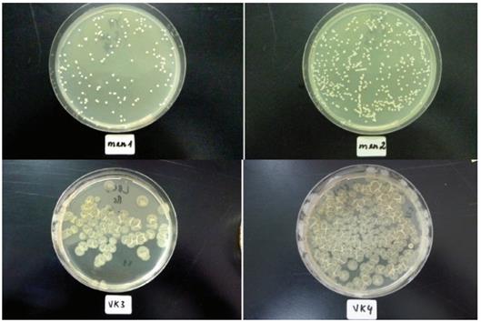 d. Ảnh chụp dưới kính hiển vi không thấy có sự sai khác về hình ảnh các chủng VSV. Saccharomyces trên môi trường YM (men1) và môi trường YM* (men2) sau 48 giờ. Bacillus subtilis trên môi trường LB (vk 3) và môi trường LB* (vk 4) sau 24 giờ.