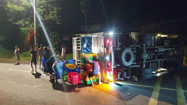 Xe tải chở tôm lật trên đường. Người dân địa phương đã cùng nhau hỗ trợ chủ hàng thu gom tôm.